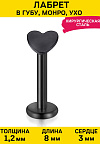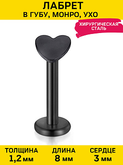 <p>Лабрет сердце черное - это изысканный и элегантный пирсинг для украшения губы. Изготовлен из высококачественного материала, который обеспечивает прочность и долговечность изделия. Толщина пирсинга составляет 1,2 мм, длина - 8 мм, а сердце на конце имеет размер 3 мм.</p>