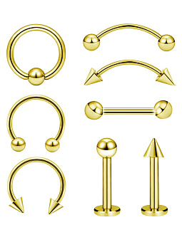 <p>Исключительный набор из 8 предметов для пирсинга выполненных из высококачественного золота - это именно то, что нужно для добавления элегантности и изысканности к вашему образу. Каждый элемент набора, отражающий современные тенденции моды, позволит вам выразить индивидуальность и подчеркнуть свой стиль.</p><p>Серьги идеальны для ношения в мочке уха, носу, брови, а также могут служить украшением для губ и пупка. Тонкий стержень толщиной всего 1,2 мм и различная длина - 6 мм, 8 мм, или 10 мм - обеспечат комфортное использование. Небольшой диаметр шарика или конуса, равняющийся 3 мм, гармонично дополнит любой образ без чрезмерного привлечения внимания.</p><p>Элегантность золота прекрасно сочетается с минималистичной формой украшений, делая их подходящими для повседневной носки и для особенных случаев. Тщательная обработка поверхности гарантирует не только великолепный внешний вид, но и безопасность при касании кожи.</p><p>Каждое украшение в наборе было создано с учетом высоких стандартов качества и дизайна, что делает эту коллекцию идеальным выбором для тех, кто ценит превосходство и роскошь в деталях.</p>