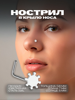 <p>Пирсинг нострил солнце серебристый - это стильное и модное украшение для носа, которое подчеркнет вашу индивидуальность. Изготовлен из высококачественного серебра, покрытого специальным покрытием, благодаря которому изделие не тускнеет со временем и не вызывает аллергических реакций. Длина пирсинга составляет 7 мм, что позволяет комфортно носить его и не вызывает дискомфорта. Загиб имеет длину 2 мм, что гарантирует надежную фиксацию украшения в носу.</p><p>Пирсинг нострил солнце серебристый диаметром 0,8 мм легко вставляется в проколы носа и отлично дополняет ваш образ. Украшение с изображением солнца диаметром 5 мм придает пирсингу неповторимый шарм и привлекает внимание окружающих.</p><p>Этот пирсинг подходит для использования в обоих ноздрях и идеально сочетается с различными стилями одежды. Он является прекрасным выбором для тех, кто хочет выделиться из толпы и придать своему образу нотку индивидуальности. Надежное и стильное украшение, которое дополнит ваш образ и подчеркнет вашу красоту!</p>
