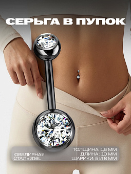 <p>Очаровательный и изысканный, пирсинг в пупок украшен блестящими черными кристаллами, придающими ему неповторимое очарование. Этот аксессуар подчеркнет вашу индивидуальность и добавит изящества каждодневному образу. Изготовленный из качественной биосовместимой стали толщиной 1,6 мм, он обеспечивает комфортное ношение и минимизирует риск аллергических реакций.</p><p>Длина стержня составляет идеальные 10 мм, что делает его универсальным для большинства пупочных проколов. Шарики размером 5 мм и 8 мм идеально подходят как для ежедневного использования, так и для особых случаев. Легкость монтажа и демонтажа пирсинга позволяет вам без труда менять украшения по вашему настроению или стилю.</p>