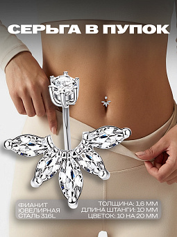 <p>Откройте для себя изысканное очарование и обновите свой образ с этим великолепным пирсингом в пупок. Прекрасно отшлифованный серебристый цветок украшен блестящими кристаллами, придавая вашему стилю нотку нежности и изысканности. Стержень из высококачественного материала имеет толщину 1,6 мм и длину 10 мм, обеспечивая комфортное ношение и идеальную посадку. Диаметр центрального кристалла составляет 5 мм, добавляя изысканности, а размеры цветочной композиции 10 мм х 20 мм подчеркивают эстетическую привлекательность украшения.</p><p>Этот пирсинг подчеркнет вашу индивидуальность и добавит изящества вашему повседневному или вечернему облику. Носите его с уверенностью и наслаждайтесь восхищенными взглядами окружающих. Это украшение станет прекрасным дополнением к вашей коллекции пирсинга или идеальным подарком для кого-то особенного.</p>