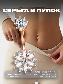 <h3>Золотистый Пирсинг для Пупка с Цветком и Кристаллами</h3><p>Исключительный аксессуар для вашего пупка – этот пирсинг выполнен в стиле утонченного цветка золотистого оттенка, усыпанный мерцающими кристаллами. Подчеркните свою индивидуальность и добавьте изысканности вашему образу с помощью этой уникальной украшающей детали.</p><p>Материал пирсинга обеспечивает комфортное использование и долговечность. Стержень толщиной 1,6 мм и длиной 10 мм идеально подходит для большинства пирсингов. Кристалл в центре деликатно переливается на свету, выделяя вас из толпы, размером в 6,5 мм он великолепно ловит лучи света. Обрамленный цветок на пирсинге имеет размер в 11 мм и является верхней точкой притяжения взглядов.</p><p>Этот золотистый пирсинг в пупок – не просто украшение, это заявление о вашем стиле и вкусе, идеальное дополнение к летнему наряду или вечернему образу. Каждый элемент исполнен с заботой о деталях, чтобы вы могли выразить свою индивидуальность и чувствовать себя уверенно в любой ситуации.</p>